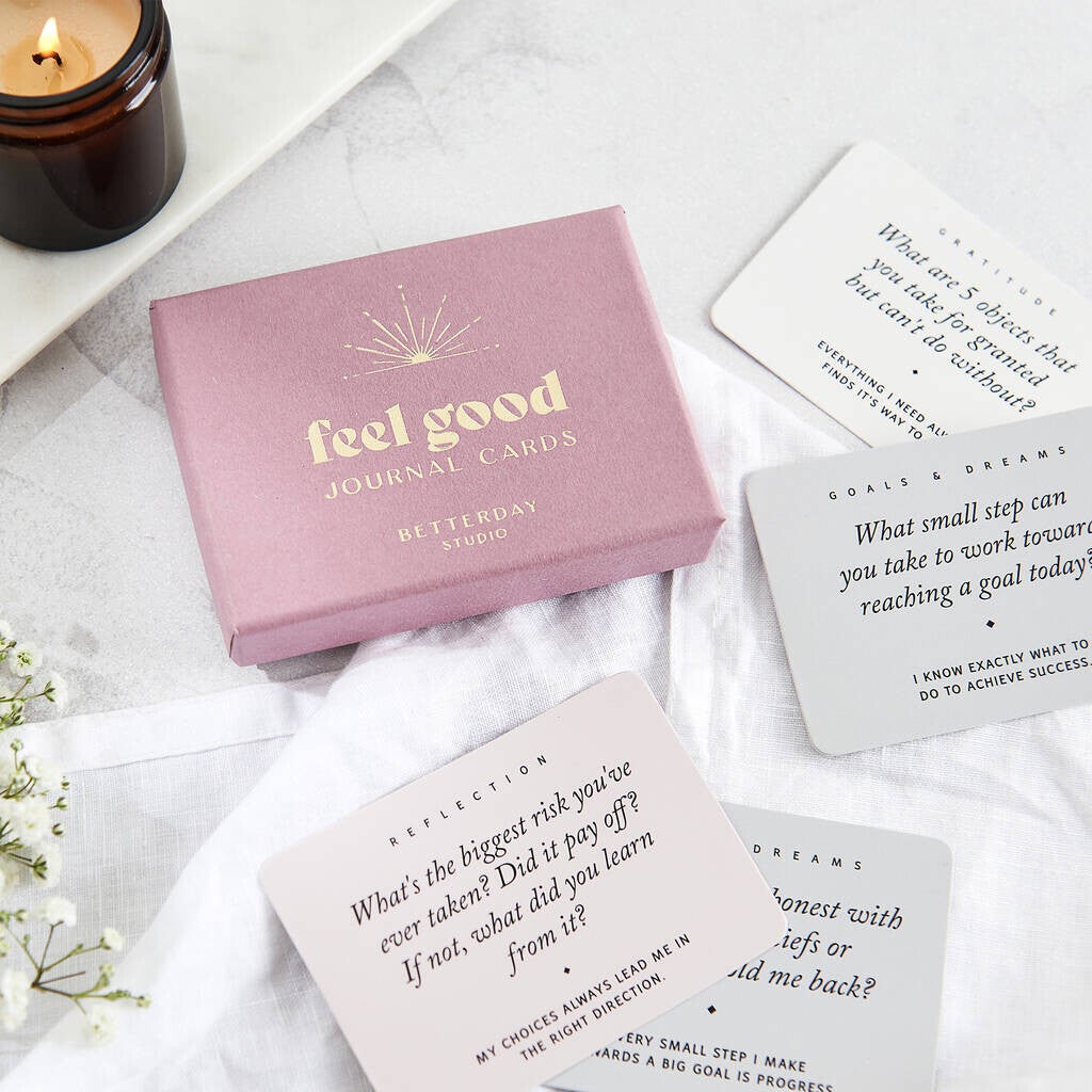 Presented in a dusky pink hard box with shimmering gold foil, these mindful journal and affirmation cards boast elegance.